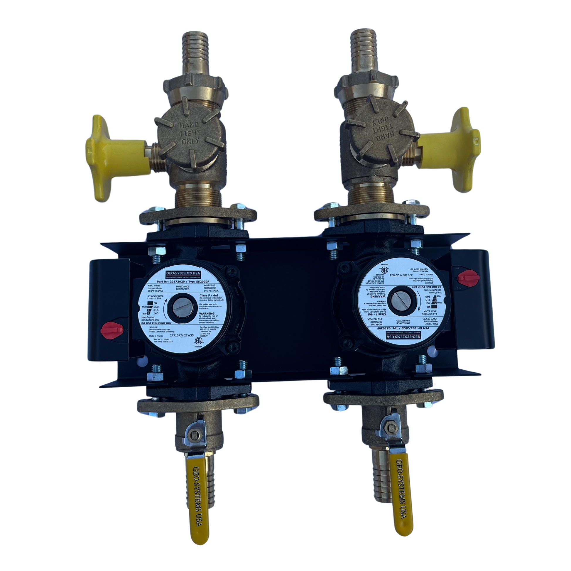 EACH FLOW CENTER WILL INCLUDE (2) GEO-SYSTEMS USA MODEL GS2020F CATAPHORESIS IRON BODY CENTRIFUGAL PUMPS WITH 1/6 HP, 1/60/230V ELECTRIC MOTORS, (2) 1" ISOLATION VALVES WITH 1" HOSE BARB CONNECTIONS, (2) 3-WAY BRASS BALL VALVES FOR FLUSHING AND PURGING OR PRESSURE AND TEMPERATURE CHECKING. ALL ASSEMBLED ON A POWDER COAT STEEL BRACKET.